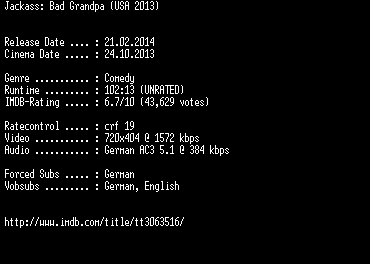 | FiLENAME: | Jackass.Bad.Grandpa.UNRATED.German.BDRiP.x264-EXQUiSiTE.mkv |