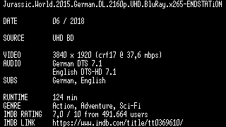 | FiLENAME: | Jurassic.World.2015.German.DL.2160p.UHD.BluRay.x265-ENDSTATiON.mkv |