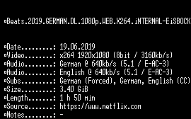 | FiLENAME: | Beats.2019.GERMAN.DL.1080p.WEB.X264.iNTERNAL-EiSBOCK.mkv |