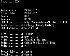 | FiLENAME: | Sacrifice.German.2016.AC3.BDRip.x264-SPiCY.mkv |