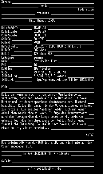 | FiLENAME: | Wild.Things.German.1998.DVDRiP.iNTERNAL.XViD-XMF.avi |