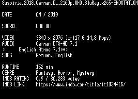 | FiLENAME: | Suspiria.2018.German.DL.2160p.UHD.BluRay.x265-ENDSTATiON.mkv |