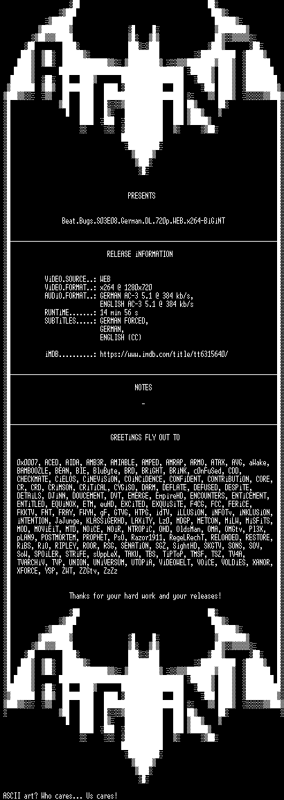| FiLENAME: | Beat.Bugs.S03E08.German.DL.720p.WEB.x264-BiGiNT.mkv |