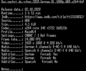 | FiLENAME: | Das.machst.du.schon.2020.German.DL.1080p.WEB.x264-WvF.mkv |