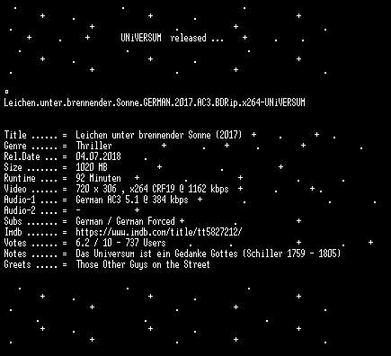| FiLENAME: | Leichen.unter.brennender.Sonne.GERMAN.2017.AC3.BDRip.x264-UNiVERSUM.mkv |