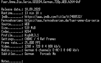| FiLENAME: | Fuer.Umme.Die.Serie.S01E04.German.720p.WEB.h264-WvF.mkv |