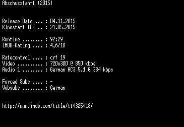 | FiLENAME: | Abschussfahrt.German.2015.AC3.BDRiP.x264-EXQUiSiTE.mkv |