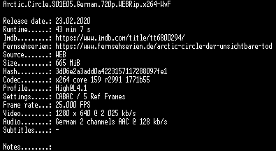 | FiLENAME: | Arctic.Circle.S01E05.German.720p.WEBRip.x264-WvF.mkv |