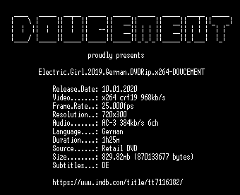 | FiLENAME: | Electric.Girl.2019.German.DVDRip.x264-DOUCEMENT.mkv |