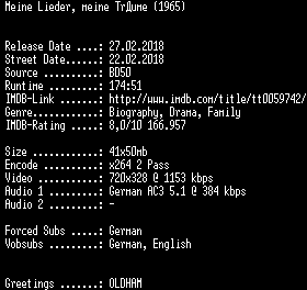 | FiLENAME: | Meine.Lieder.meine.Traeume.German.REMASTERED.1965.AC3.BDRip.x264-SPiCY.mkv |