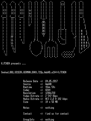 | FiLENAME: | Smoked.BBQ.S01E08.GERMAN.DOKU.720p.WebHD.x264-KiTCHEN.mkv |