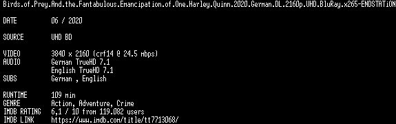 | FiLENAME: | Birds.of.Prey.And.the.Fantabulous.Emancipation.of.One.Harley.Quinn.2020.German.DL.2160p.UHD.BluRay.x265-ENDSTATiON.mkv |
