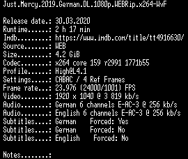 | FiLENAME: | Just.Mercy.2019.German.DL.1080p.WEBRip.x264-WvF.mkv |