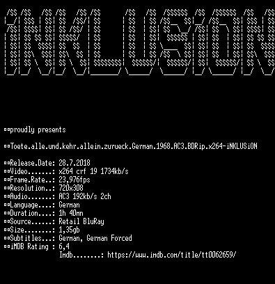 | FiLENAME: | Toete.alle.und.kehr.allein.zurueck.German.1968.AC3.BDRip.x264-iNKLUSiON.mkv |