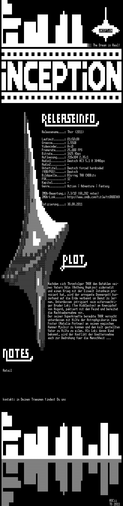 | FiLENAME: | Thor.2011.German.AC3.BDRip.XviD-iNCEPTiON.avi |