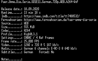 | FiLENAME: | Fuer.Umme.Die.Serie.S01E11.German.720p.WEB.h264-WvF.mkv |