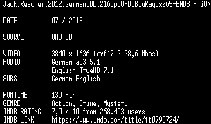 | FiLENAME: | Jack.Reacher.2012.German.DL.2160p.UHD.BluRay.x265-ENDSTATiON.mkv |