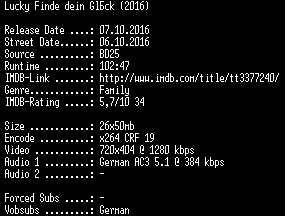 | FiLENAME: | Lucky.Finde.dein.Glueck.German.2016.AC3.BDRip.x264-SPiCY.mkv |
