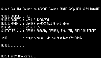 | FiLENAME: | Sword.Gai.The.Animation.S02E09.German.ANiME.720p.WEB.x264-BiGiNT.mkv |