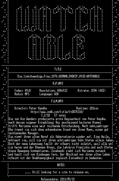 | FiLENAME: | Die.linkshaendige.Frau.1978.GERMAN.DVDRIP.XVID-WATCHABLE.avi |