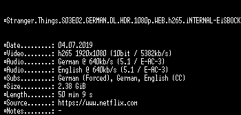 | FiLENAME: | Stranger.Things.S03E02.GERMAN.DL.HDR.1080p.WEB.h265.iNTERNAL-EiSBOCK.mkv |