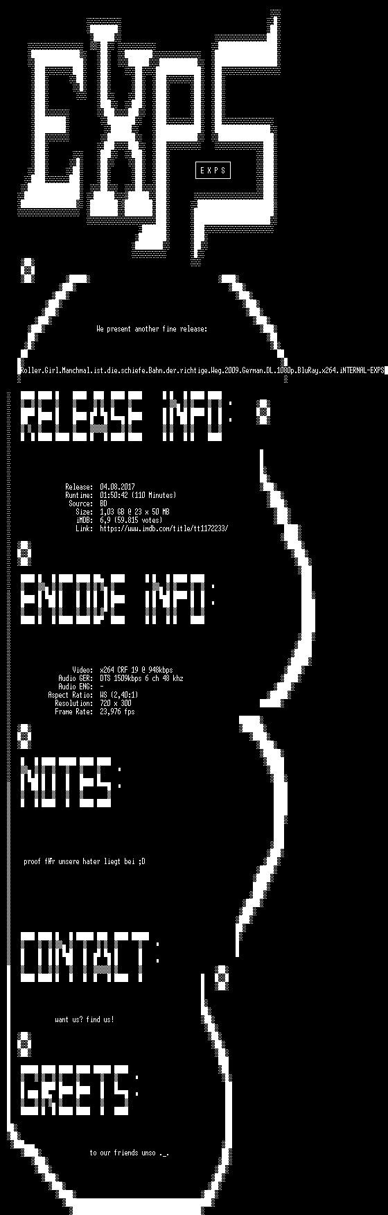 | FiLENAME: | Roller.Girl.Manchmal.ist.die.schiefe.Bahn.der.richtige.Weg.German.2009.AC3.BDRip.x264.iNTERNAL-EXPS.mkv |