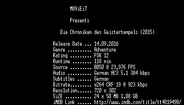 | FiLENAME: | Die.Chroniken.des.Geistertempels.German.2015.AC3.BDRip.x264-MOViEiT.mkv |