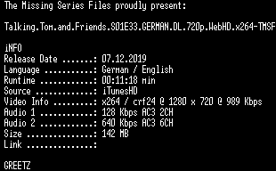 | FiLENAME: | Talking.Tom.and.Friends.S01E33.GERMAN.DL.720p.WebHD.x264-TMSF.mkv |