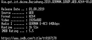 | FiLENAME: | Wie.gut.ist.deine.Beziehung.2019.GERMAN.1080P.WEB.H264-VOiD.mkv |
