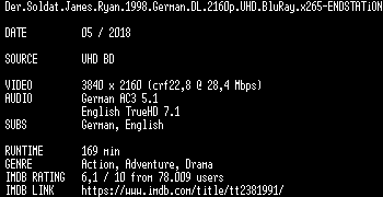 | FiLENAME: | Der.Soldat.James.Ryan.1998.German.DL.2160p.UHD.BluRay.x265-ENDSTATiON.mkv |