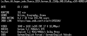 | FiLENAME: | Le.Mans.66.Gegen.jede.Chance.2019.German.DL.2160p.UHD.BluRay.x265-HDMEDiA.mkv |
