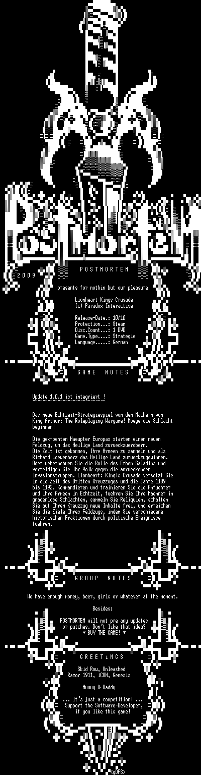 | FiLENAME: | Lionheart.Kings.Crusade.GERMAN-POSTMORTEM.iso |