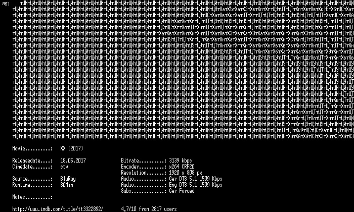 | FiLENAME: | XX.2017.German.DL.1080p.BluRay.x264-LizardSquad.mkv |