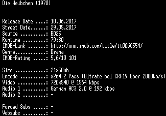 | FiLENAME: | Die.Weibchen.German.REMASTERED.1970.AC3.BDRip.x264-SPiCY.mkv |