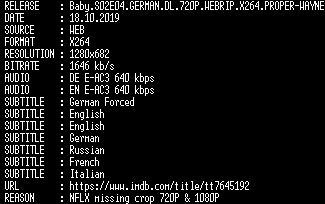 | FiLENAME: | Baby.S02E04.GERMAN.DL.720P.WEBRIP.X264.PROPER-WAYNE.mkv |