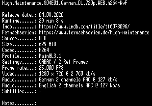 | FiLENAME: | High.Maintenance.S04E01.German.DL.720p.WEB.h264-WvF.mkv |
