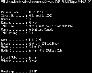| FiLENAME: | VIP.Mein.Bruder.der.Supermann.German.1968.AC3.BDRip.x264-SPiCY.mkv |