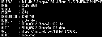 | FiLENAME: | Tell.Me.A.Story.S01E01.GERMAN.DL.720P.WEB.X264-WAYNE.mkv |