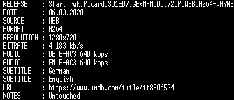 | FiLENAME: | Star.Trek.Picard.S01E07.GERMAN.DL.720P.WEB.H264-WAYNE.mkv |