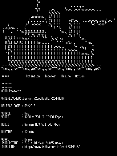 | FiLENAME: | UnREAL.S04E06.German.720p.WebHD.x264-AIDA.mkv |