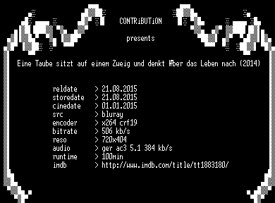 | FiLENAME: | Eine.Taube.sitzt.auf.einem.Zweig.und.denkt.ueber.das.Leben.nach.2014.German.BDRip.x264-CONTRiBUTiON.mkv |