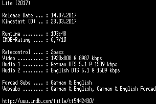 | FiLENAME: | Life.2017.German.DTS.DL.1080p.BluRay.x264-COiNCiDENCE.mkv |
