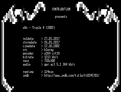| FiLENAME: | xXx.Triple.X.2002.Remastered.German.BDRip.x264-CONTRiBUTiON.mkv |