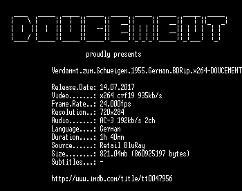 | FiLENAME: | Verdammt.zum.Schweigen.1955.German.BDRip.x264-DOUCEMENT.mkv |