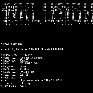 | FiLENAME: | The.Viking.War.German.2019.AC3.BDRip.x264-iNKLUSiON.mkv |