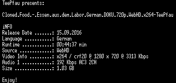 | FiLENAME: | Cloned.Food.-.Essen.aus.dem.Labor.German.DOKU.720p.WebHD.x264-TeePfau.mkv |