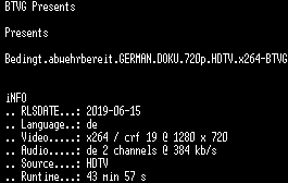 | FiLENAME: | Bedingt.abwehrbereit.GERMAN.DOKU.720p.HDTV.x264-BTVG.mkv |