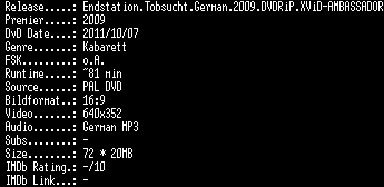 | FiLENAME: | Endstation.Tobsucht.German.2009.DVDRiP.XViD-AMBASSADOR.avi |