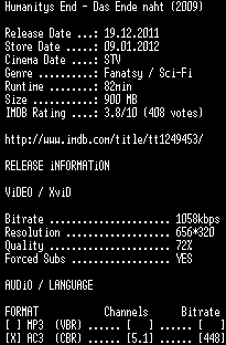 | FiLENAME: | Humanitys.End.Das.Ende.naht.German.2009.AC3.BDRip.XviD-OBLiGATED.avi |