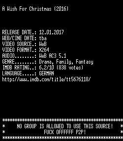 | FiLENAME: | A.Wish.For.Christmas.2016.German.720p.WebHD.x264-SLG.mkv |
